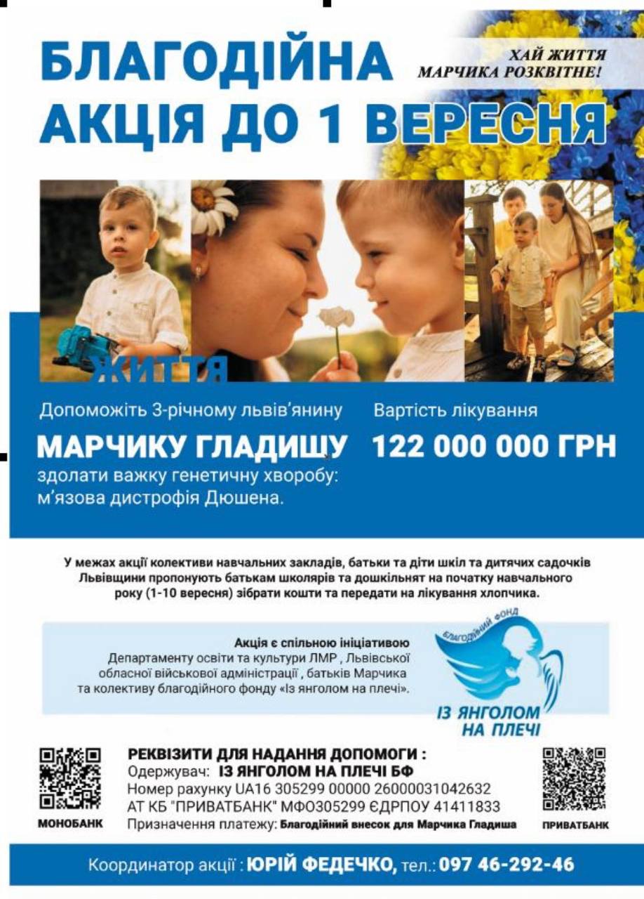 Шановні батьки! 💙 Пропонуємо розпочати навчальний рік доброю справою, разом зі школами нашого міста. Львів’янин, 3-річний хлопчик Марчик бореться з важким захворюванням – м’язовою дистрофією Дюшена. Єдиний шанс на життя – дороговартісне лікування препаратом Евелідіс. Наша школа долучається до акції «Хай життя Марчика розквітне». Просимо вас (якщо маєте можливість і добру волю) зробити посильний внесок у своєму класі, а 1 вересня ми разом перерахуємо зібрані кошти на рахунок благодійного фонду.” З янголом на плечі”. В холі школи також буде стояти скринька для внесків. Хай добро, яке ми подаруємо дитині, стане для Марчика шансом на щасливе майбутнє 🌸